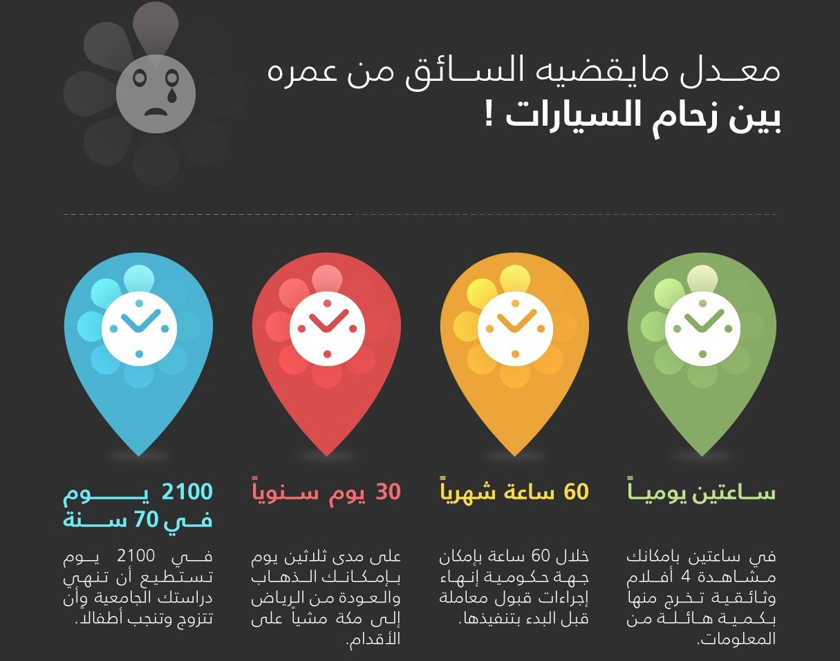 انفوجرافيك يصف بعض المعلومات حول معدل مايقضيه السائق من عمره بين زحام السيارات, وفيه بعض المعلومات المفيدة التي تضيف لك المزيد من المعلومات!