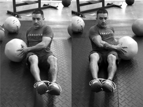 On the Gas: If you're getting through 3 sets of 30 with no trouble, it's time to grab something heavy. For Mason Twists, you'll want to use something fairly light and easily held, like a basketball, medicine ball or similar. Use a baby, in a pinch. You can also try keeping your legs straight out in front of you for an extra spicy variation.