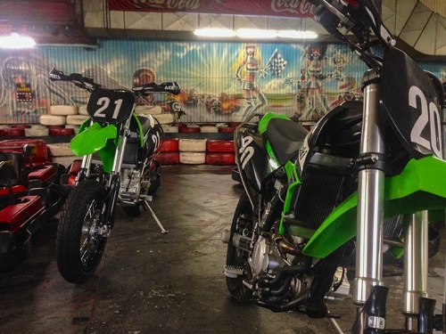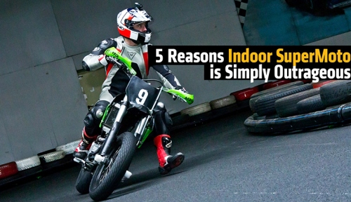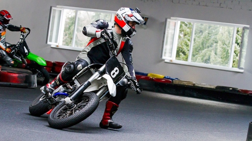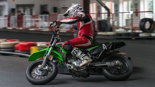Indoor Super Moto is not only better laughs than a day at Wal-Mart, it teaches, humbles and makes good bikers even better. Feel, brake, clutch, throttle, body position and vision are just as important on a little kart track as it is on a 11 meter wide patch of tarmac.