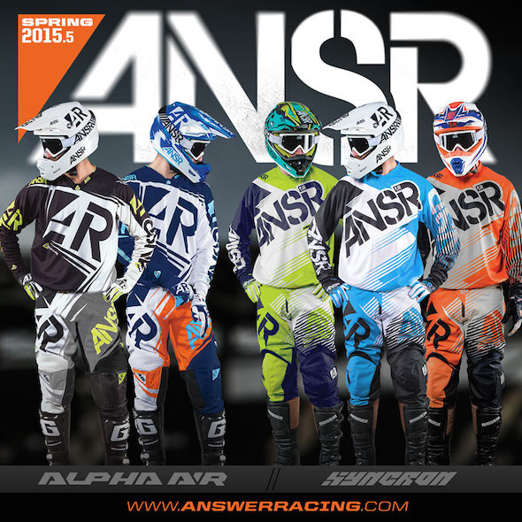 “Answer Racing has been producing the highest quality moto gear since 1976,” says Brand Manager Randy Valade. “We are pleased to keep that tradition rolling with the launch of our Spring Collection.” Highlighting the 2015 collection are two new colorways for the Alpha Air vented race wear and three new color schemes for the popular Syncron line.