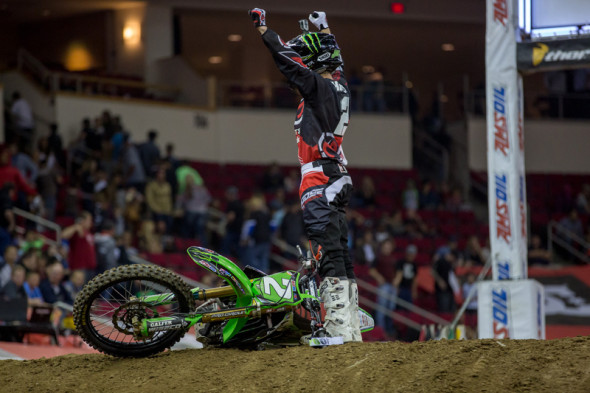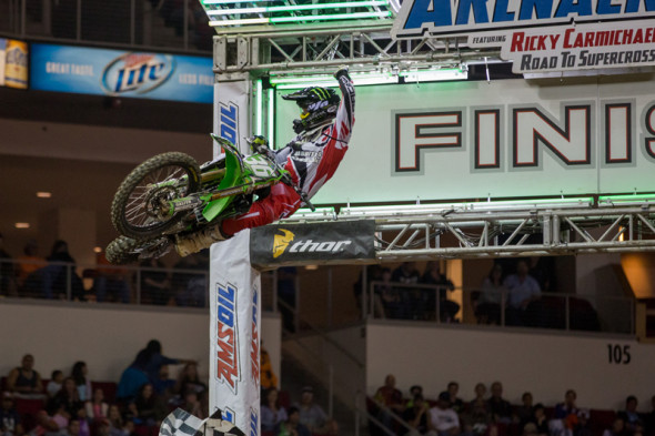 AMSOIL Arenacross, featuring Ricky Carmichael’s Road to Supercross, made its lone visit to California on Saturday, hosting the second to last round of the 2015 season from Save Mart Center. The fifth round of the Race to the Championship featured a competitive evening of competition that saw Team Kawasaki‘s Jacob Hayes take his second consecutive overall win on the heels of a pair of consistent Arenacross Class Main Events. In the Western Regional Arenacross Lites Class, KTM’s Dave Ginolfi posted a dominant wire-to-wire victory.