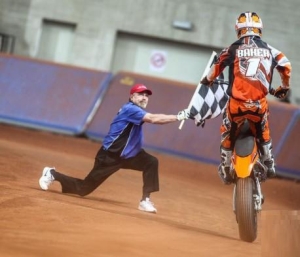 During the early stages of the winner-take-all Superfinal, 2013 AMA Pro Flat Track Grand National Champion Brad Baker and reigning MotoGP World Champion Marc Marquez battled back and forth. Marquez made contact with Baker and opened a small gap. Baker hunted Marquez down and, again, contact.
