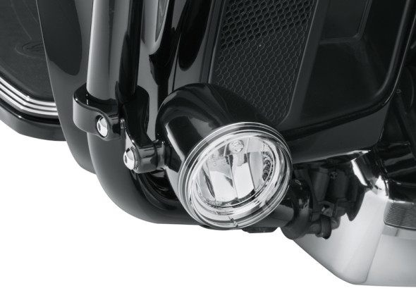 Offered with a choice of gloss black or chrome housing, Daymaker Reflector LED Fog Lamp kits fit Dyna®, Softail®, Touring and Trike models equipped with 1.25-inch diameter engine guards, but do not fit models with the accessory Mustache Engine Guards.