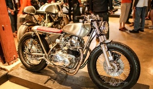 The motorcycle show featured 110 bikes ranging from a 1911 Flying Merkel to several fresh-paint customs from across the US, plus Colombia and Mexico. It was a representative sampling of what’s happening in the Alt.Moto scene today, with a café racer bias, although plenty of choppers, vintage, and just plain oddballs were parked inside, with enough space that everyone could see everything, even when the joint was busting at the seams on Friday and Saturday evenings. The Handbuilt philosophy is self-explanatory; a generation of screen-gazers needs a kick in the pants, and a wrench in the hand. Because cussing at an old motorcycle, or any Real-Life hobby, builds character, as the Bearded Ones have discovered (okay, some of them). Art counts too, so the walls held an exhibition of painters, graphic designers, and photographers (which in full disclosure included yours truly, as half of MotoTintype, with Susan McLaughlin), and the Oil&Ink Expo.