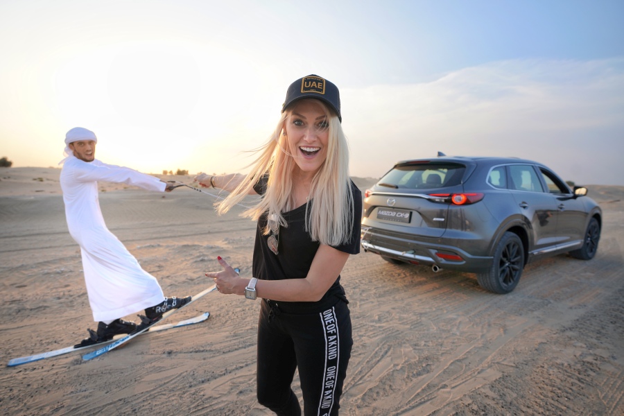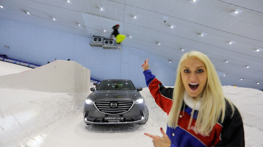 Hirschi began the stunt by towing Emirati professional skier, Hassan Fardan, to the top of Ski Dubai’s artificial slopes in the New Mazda CX-9 Signature Line SUV fitted with Continental Tires’ specially-made snow tyres. She then drove to the bottom of the slope, while Fardan himself raced down. During the run, Fardan hit a jump and gained enough height to clear the Mazda SUV.
