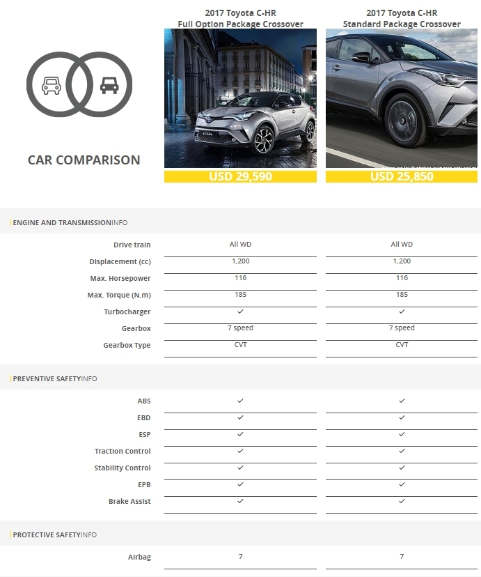 Toyota Lebanon is offering two trims for the C-HR, a standard package andFull Option Package. Both trims are powered by a 1.2 turbocharged engine, 116 HP and a 7 speed CVT transmission, all-wheel drive. While a 116 HP on an All-wheel drive might not sounds too appealing for some, we think it makes a nice efficient city car.