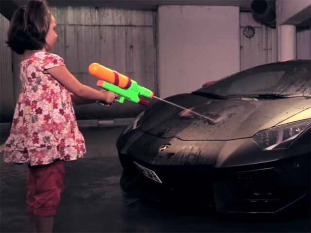 In cold weather, water or ice, the Aventador features a matte black finish; whereas, in the sun or in warm water, the Ironman graffiti will show!