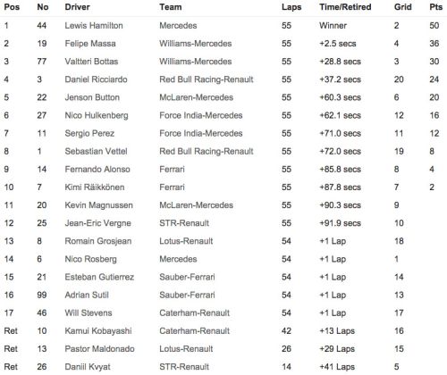 Williams took a shot at beating Hamilton to the race win by putting second-placed Felipe Massa on to super-soft tyres for a short final stint at his final stop with 12 laps to go. Massa closed to within nine seconds of Hamilton with eight laps to go and kept reducing the gap but Hamilton controlled his pace to ensure he had plenty of margin in hand to keep Massa at bay.