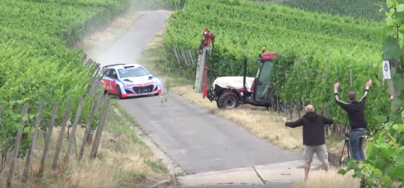 Out of nowhere, in the middle of the rally, a tractor came out on the road without any warning and almost crashed with the Hyundai i20 racing car!